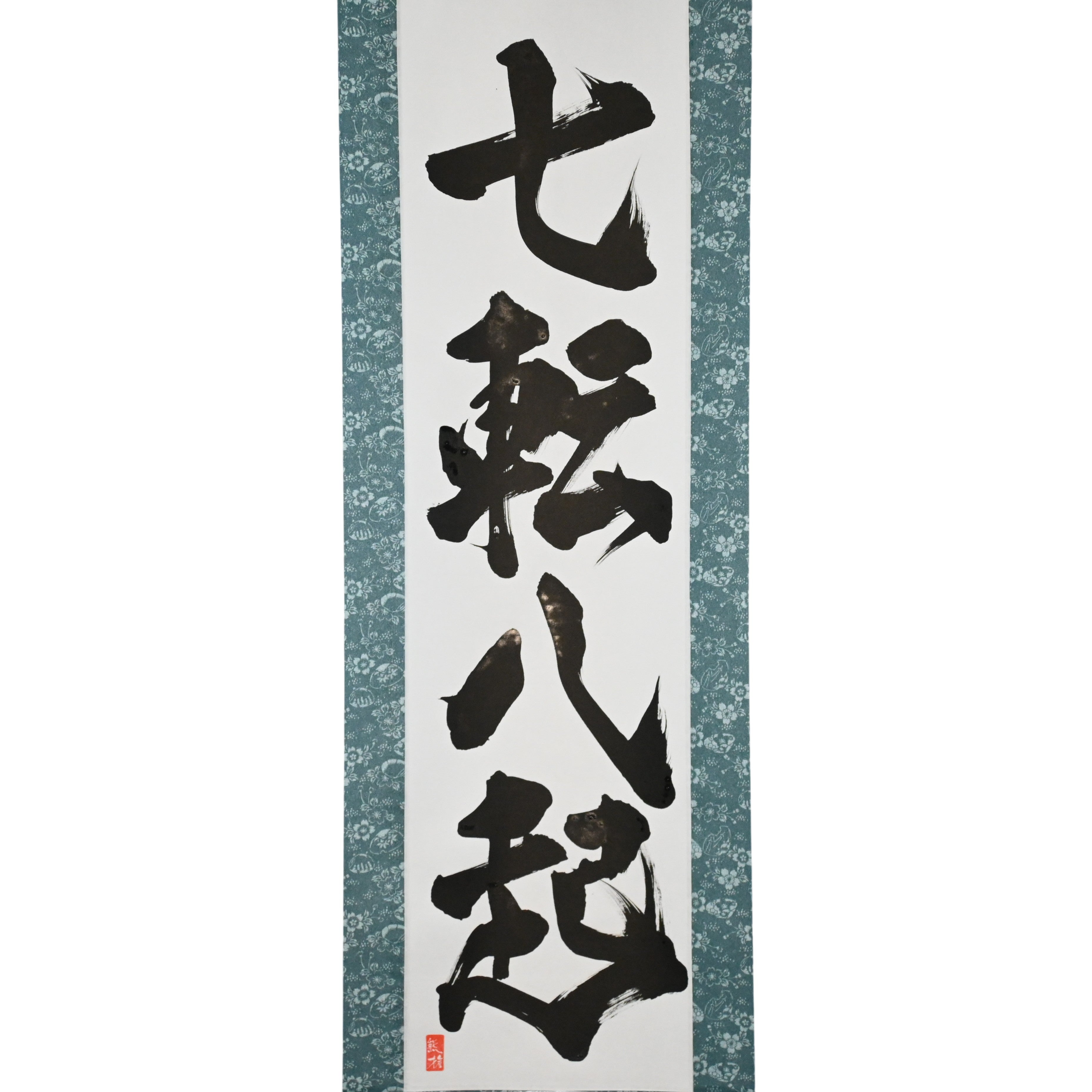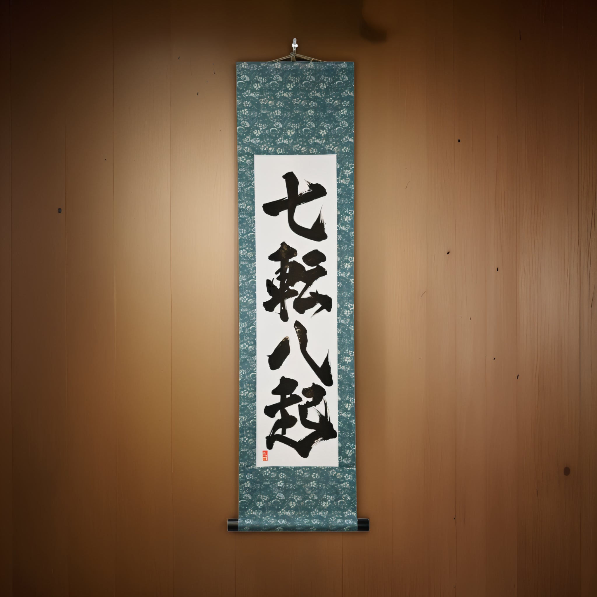 Este pergamino de caligrafía japonesa presenta la poderosa frase 七転八起 (Shichiten Hakki) — que significa "Cae siete veces, levántate ocho". Encapsula el espíritu indomable del samurái: la determinación inquebrantable de levantarse de nuevo, sin importar cuántas veces la vida te derribe.
