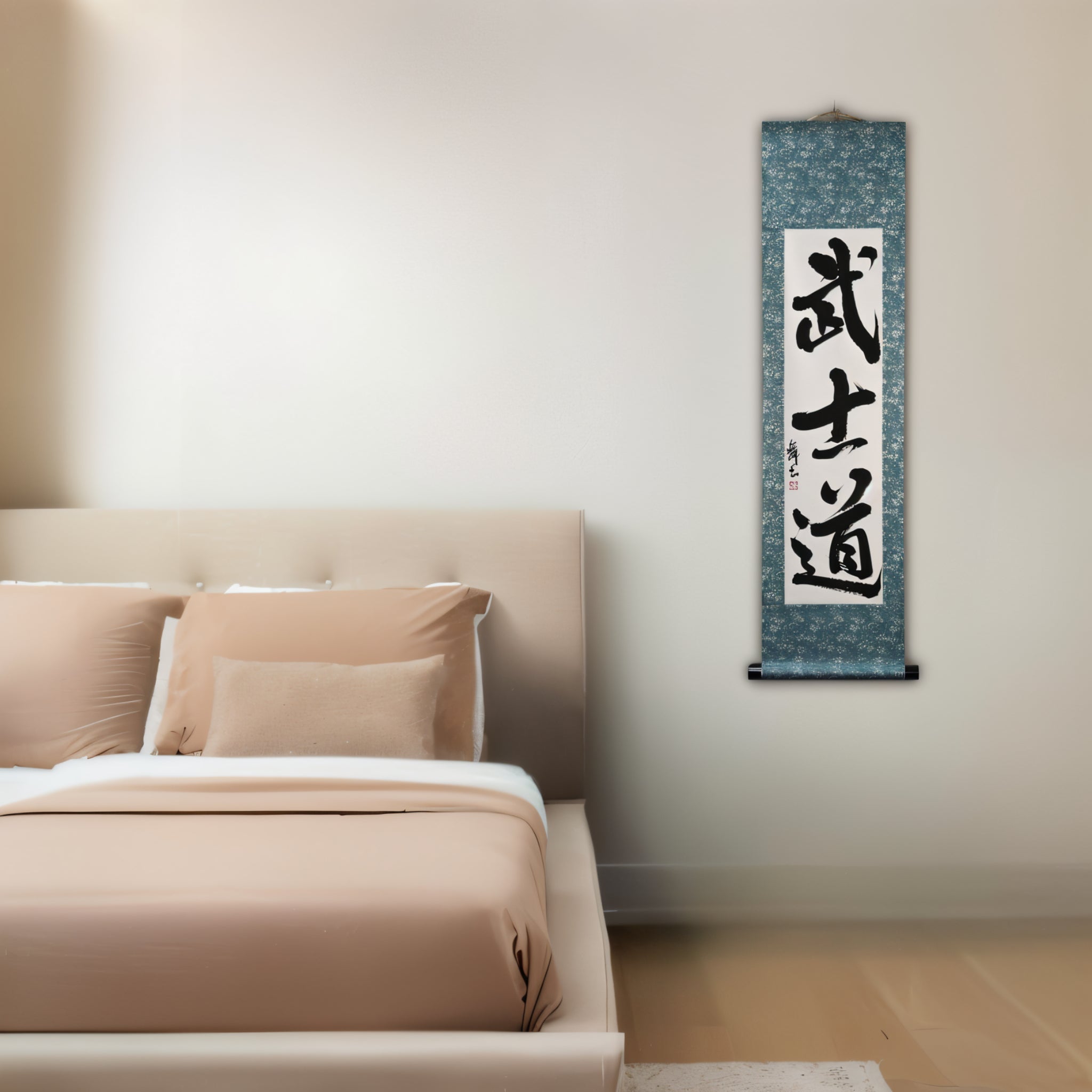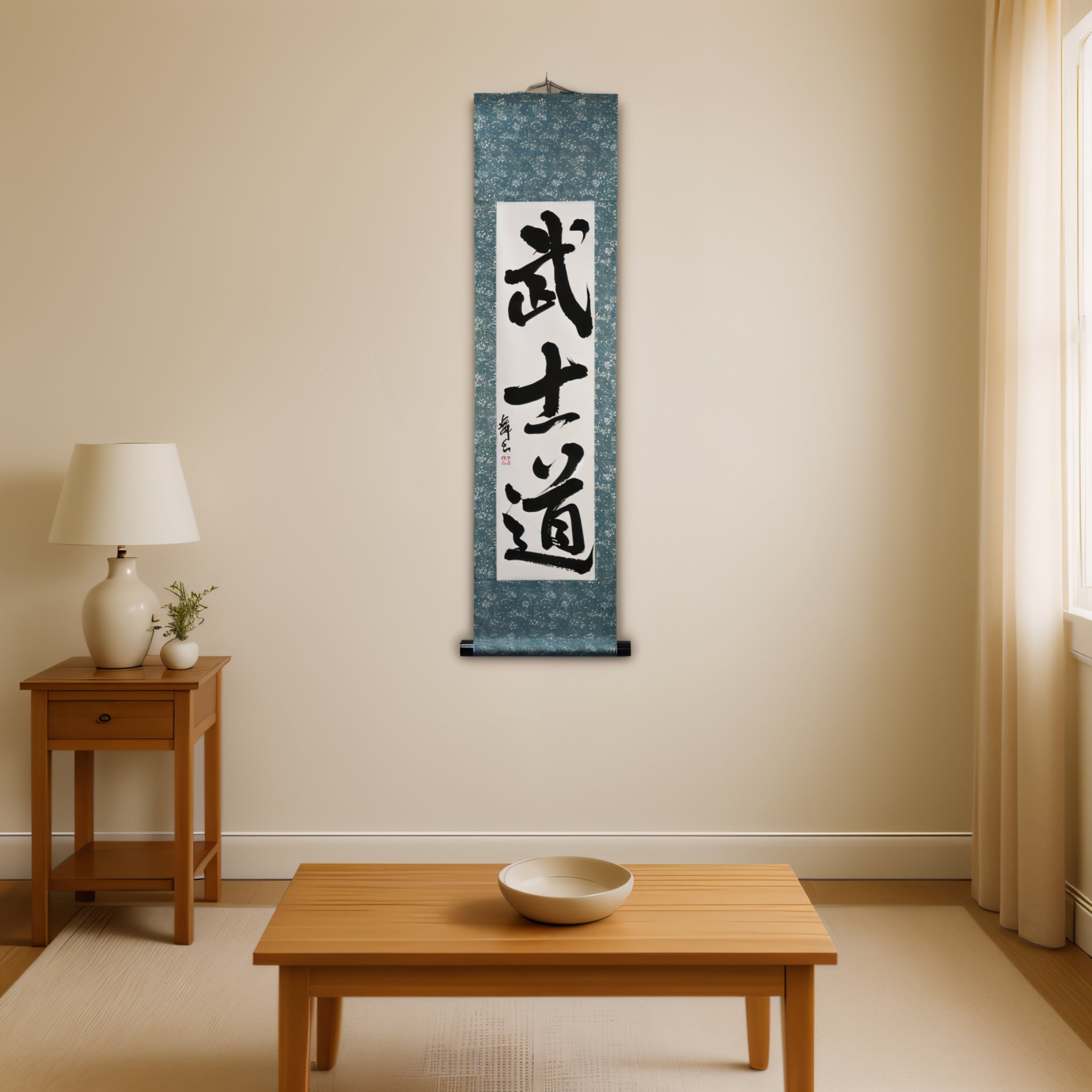 Este pergamino de caligrafía presenta la poderosa palabra 武士道 (Bushidō), que encarna el camino del Samurai.
