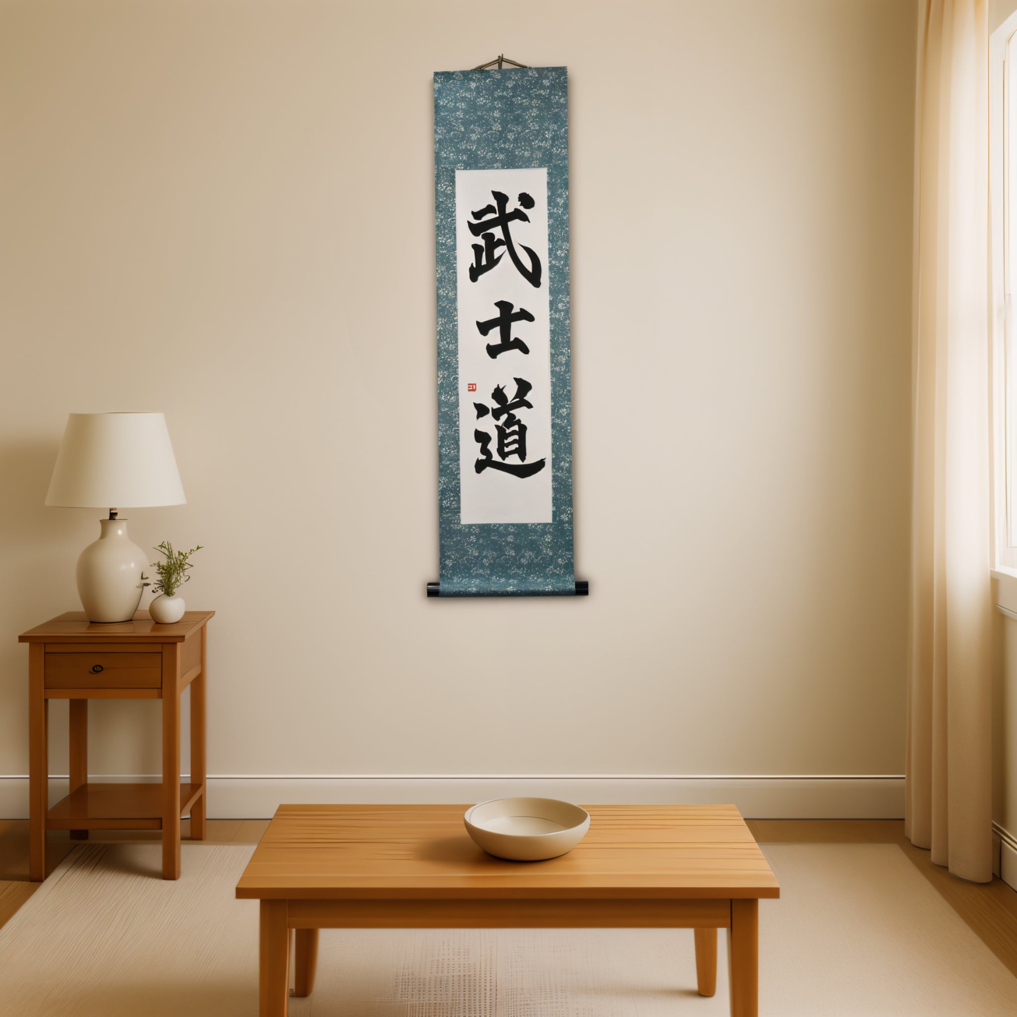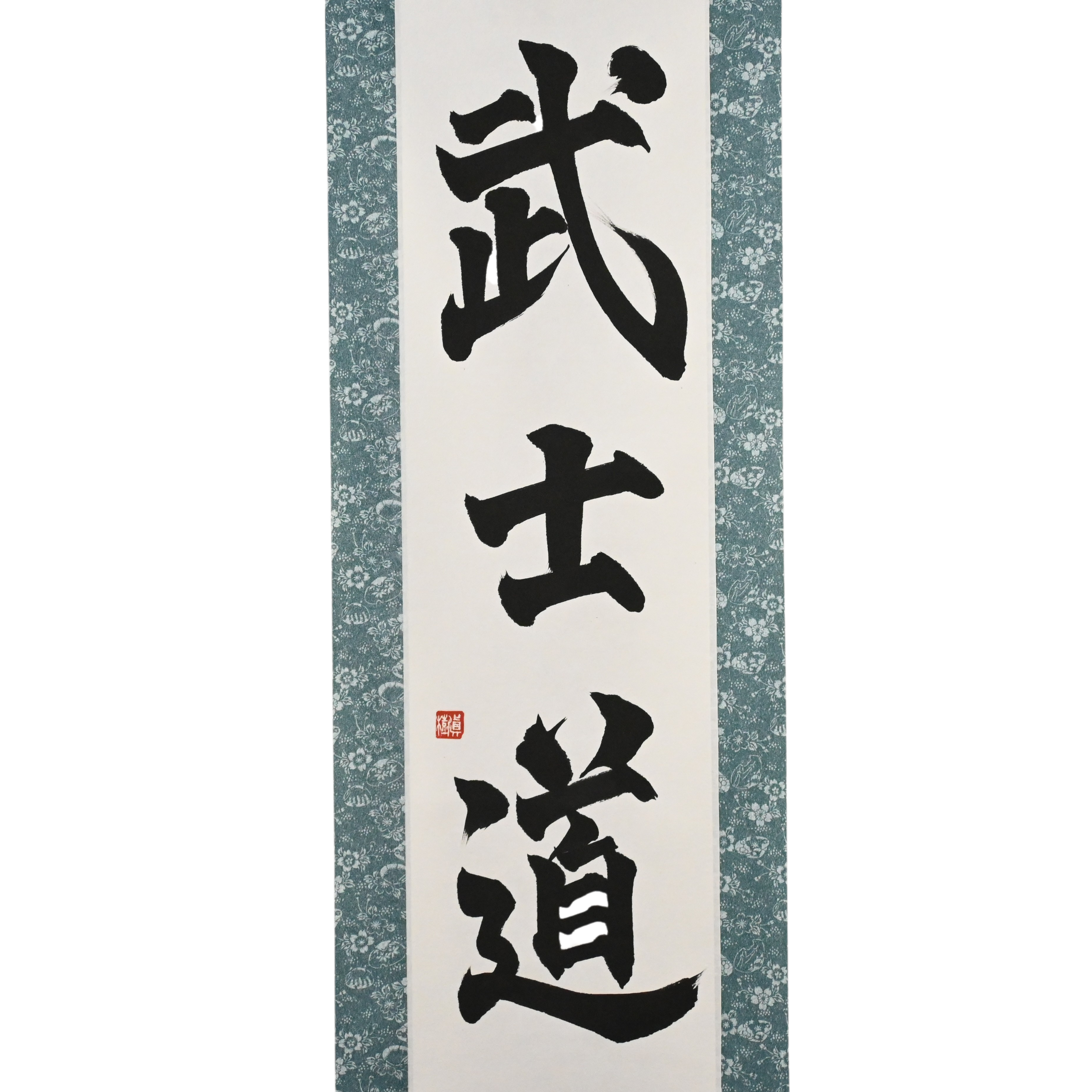 Este pergamino de caligrafía presenta la poderosa palabra 武士道 (Bushidō), que encarna el camino del Samurai.