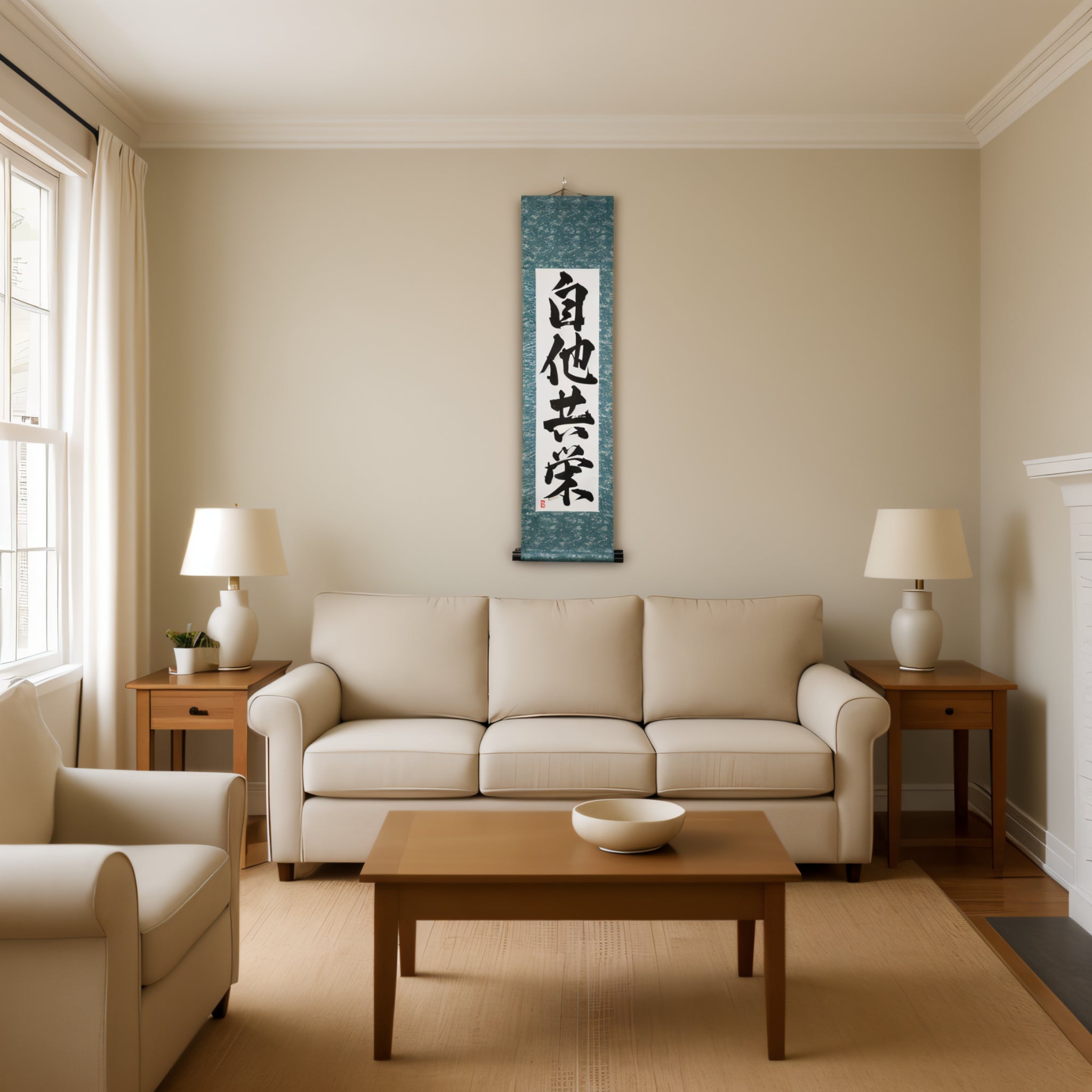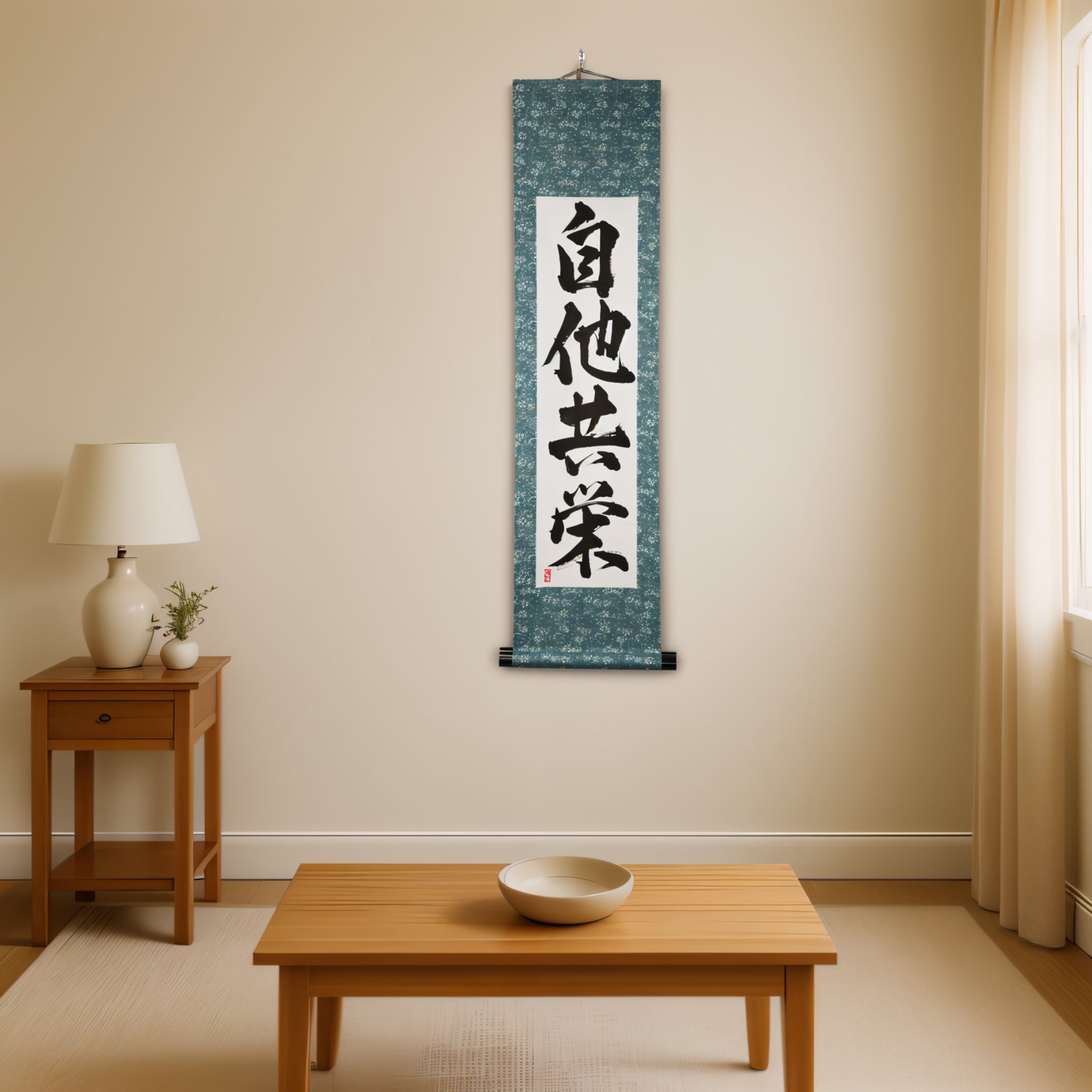 Ce rouleau de calligraphie japonaise présente la phrase intemporelle 自他共栄 (Jita-Kyōei) — traduite par "Bien-être et bénéfice mutuels". C'est l'un des deux principes fondamentaux du Judo, aux côtés de 精力善用 (Seiryoku-Zenyō, "Utilisation maximale efficace de l'énergie"), tous deux établis par le fondateur du Judo, Jigoro Kano (嘉納治五郎).