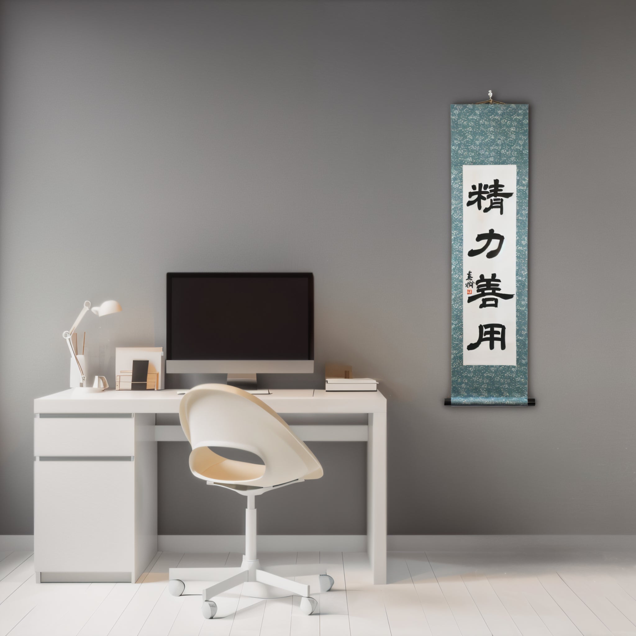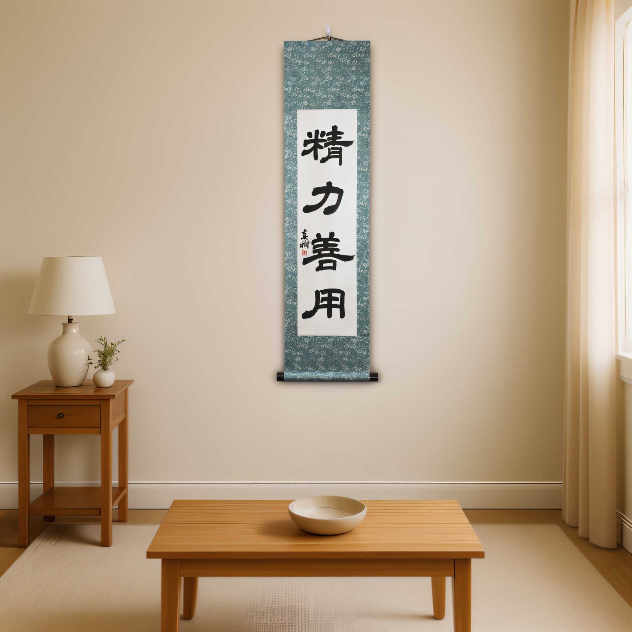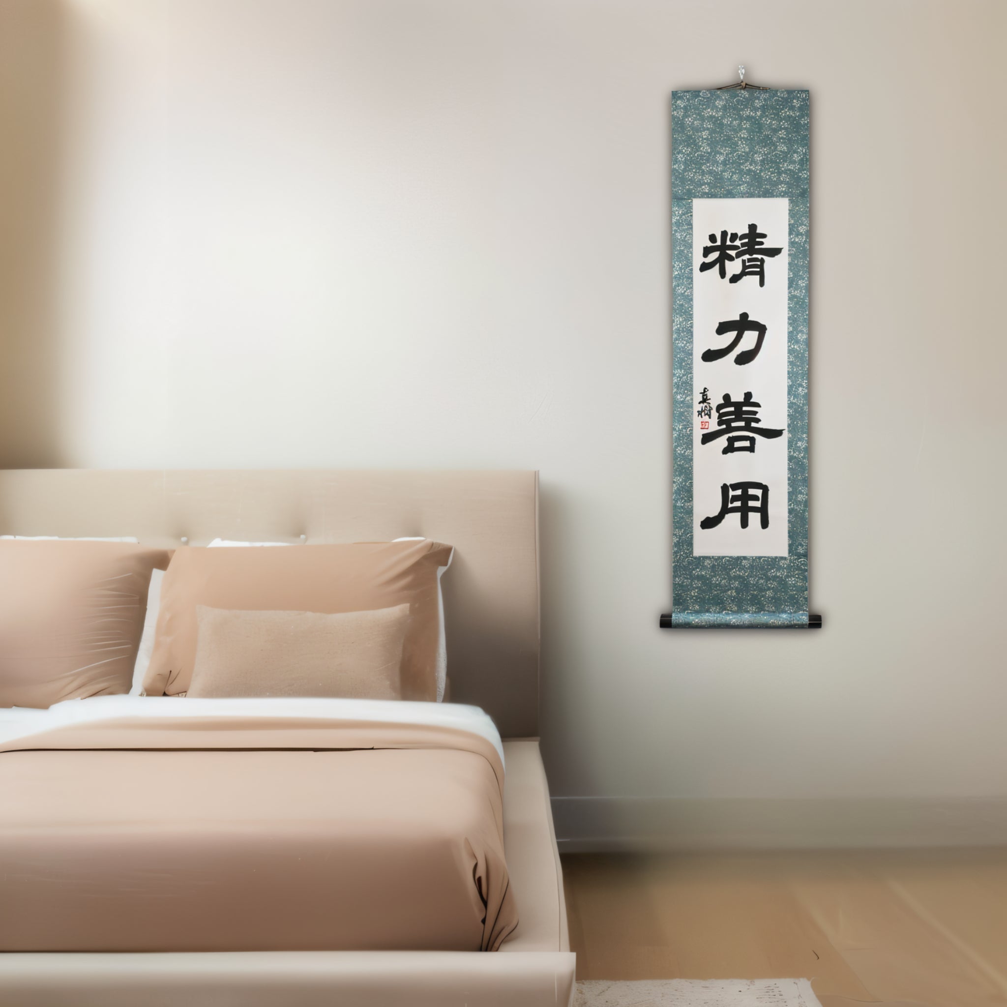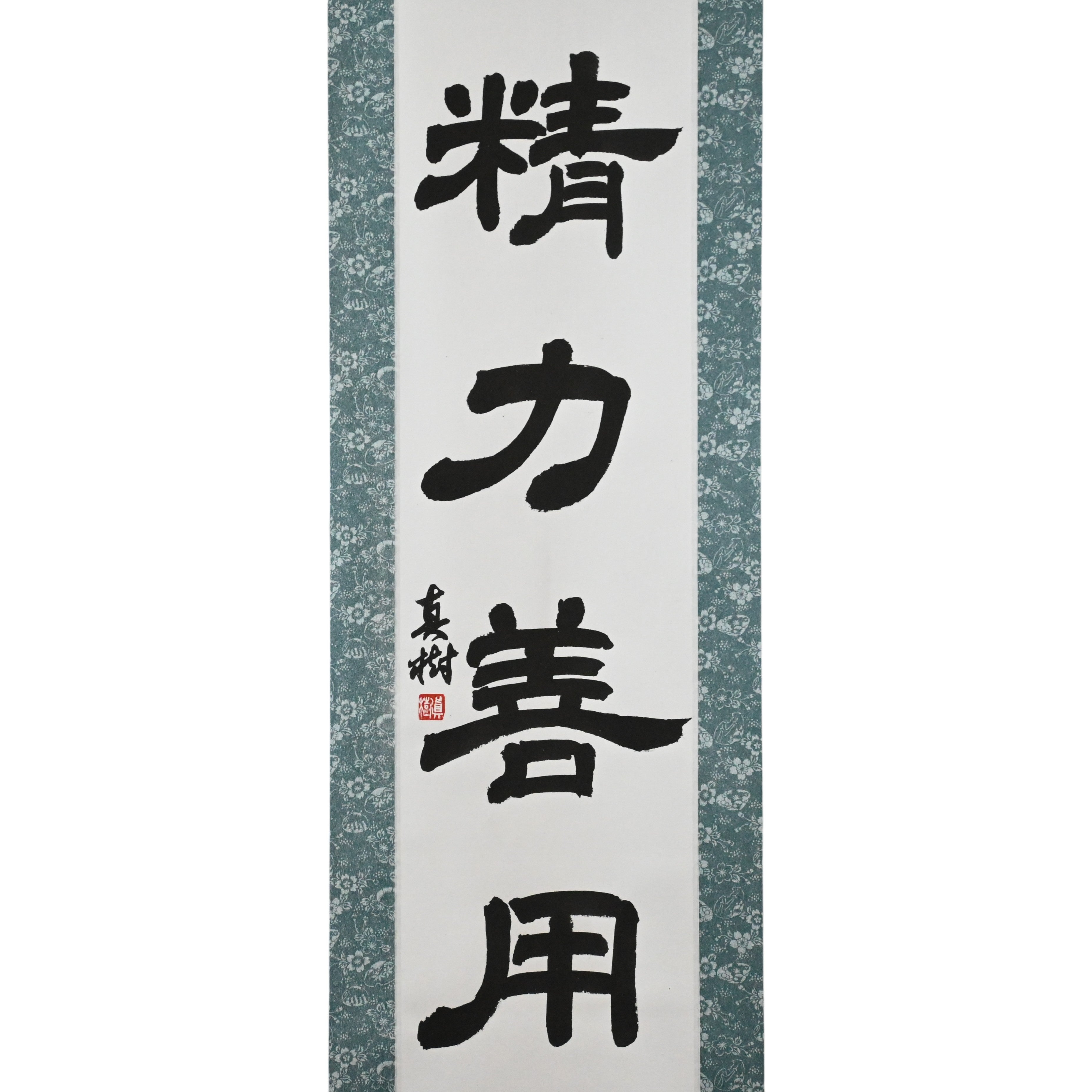 Ce rouleau de calligraphie japonaise présente la phrase intemporelle 精力善用 (Seiryoku-Zenyō) — traduite par « Utilisation maximale et efficace de l'énergie ». C'est l'un des deux principes fondamentaux du judo, aux côtés de 自他共栄 (Jita-Kyōei, « Bien-être et bénéfice mutuels »), tous deux établis par le fondateur du judo, Jigoro Kano (嘉納治五郎).