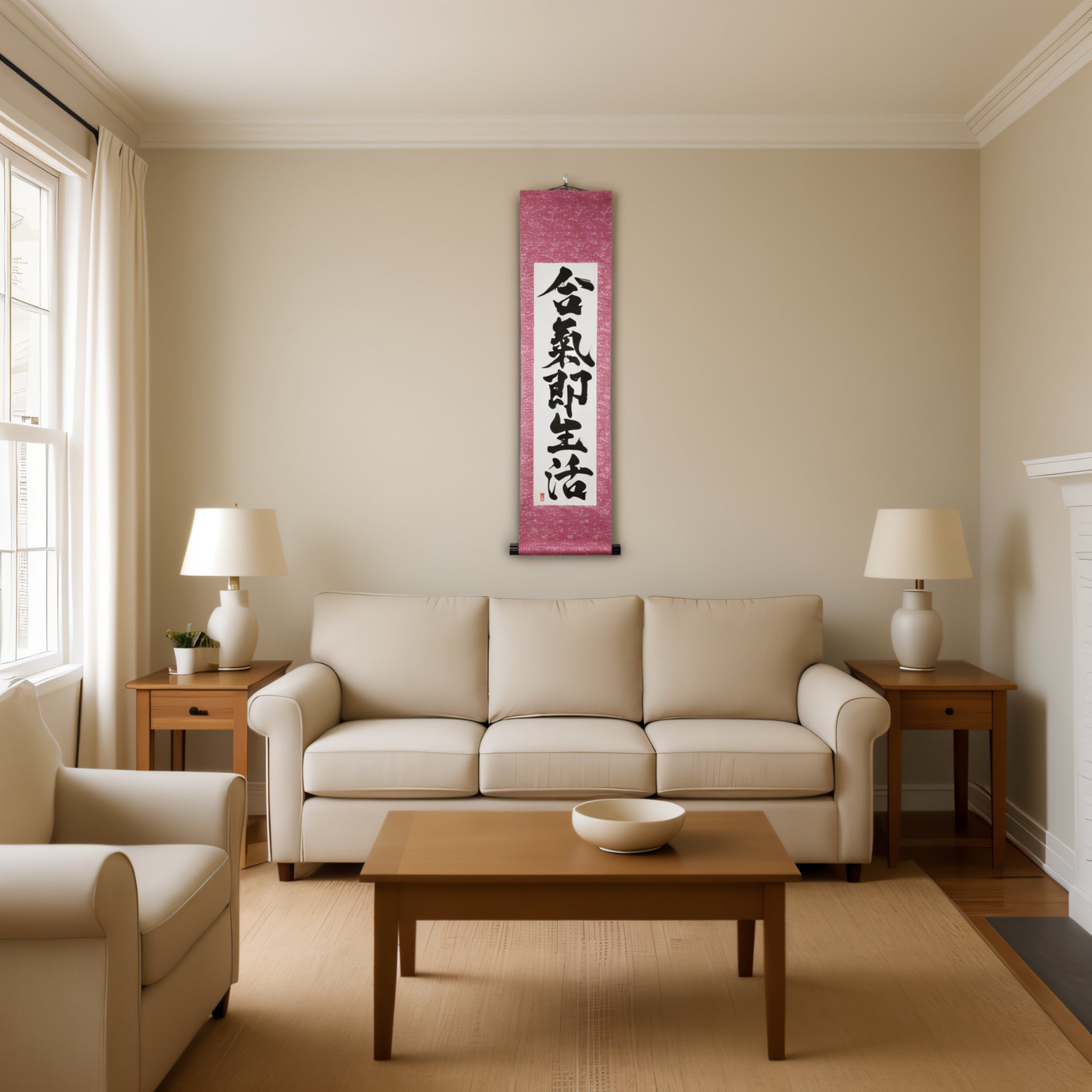 This Japanese calligraphy scroll features the profound phrase 合気即生活 (Aiki Soku Seikatsu) — "Aikido is daily life". It expresses a core principle of Aikido: the art is not confined to the dojo, but flows through every moment of our lives.