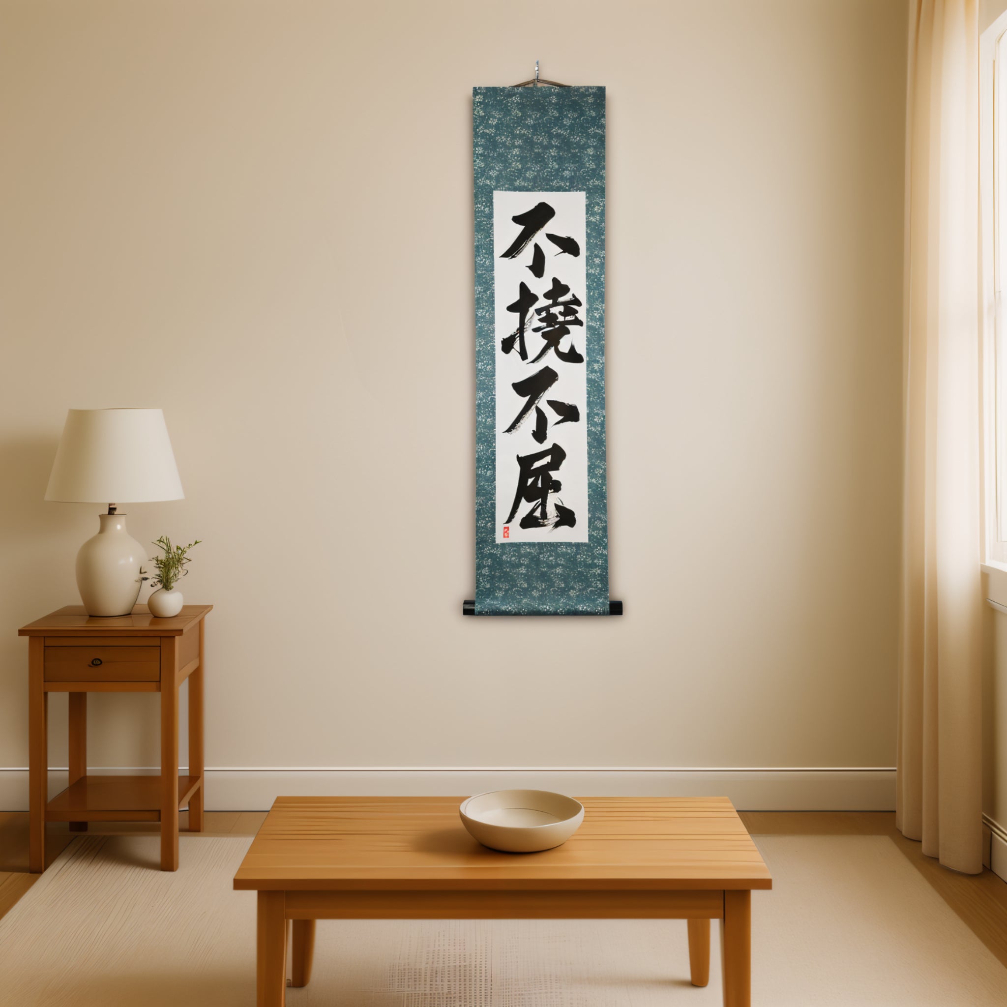 This Japanese calligraphy scroll features the bold phrase 不撓不屈 (Futō Fukutsu) — a powerful expression of the indomitable spirit that lies at the heart of Japanese martial arts and the Samurai code.
