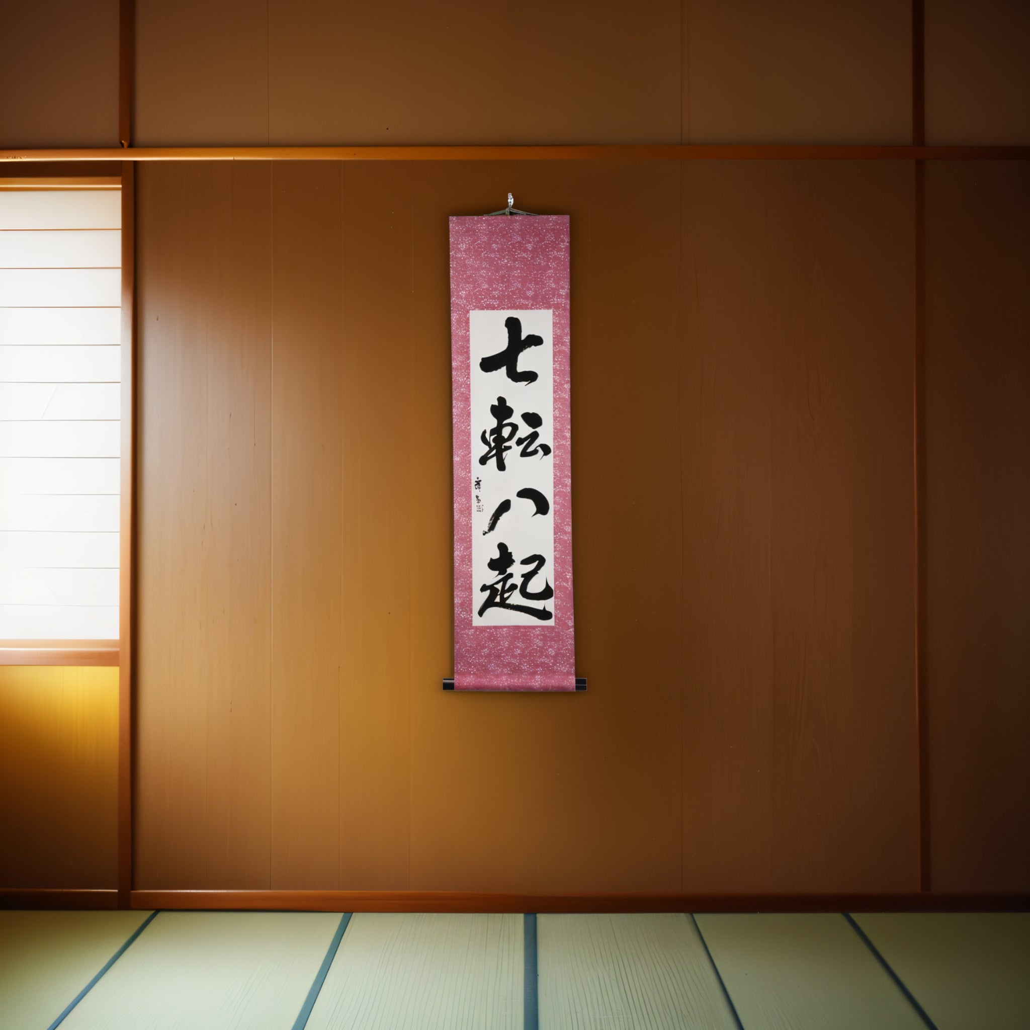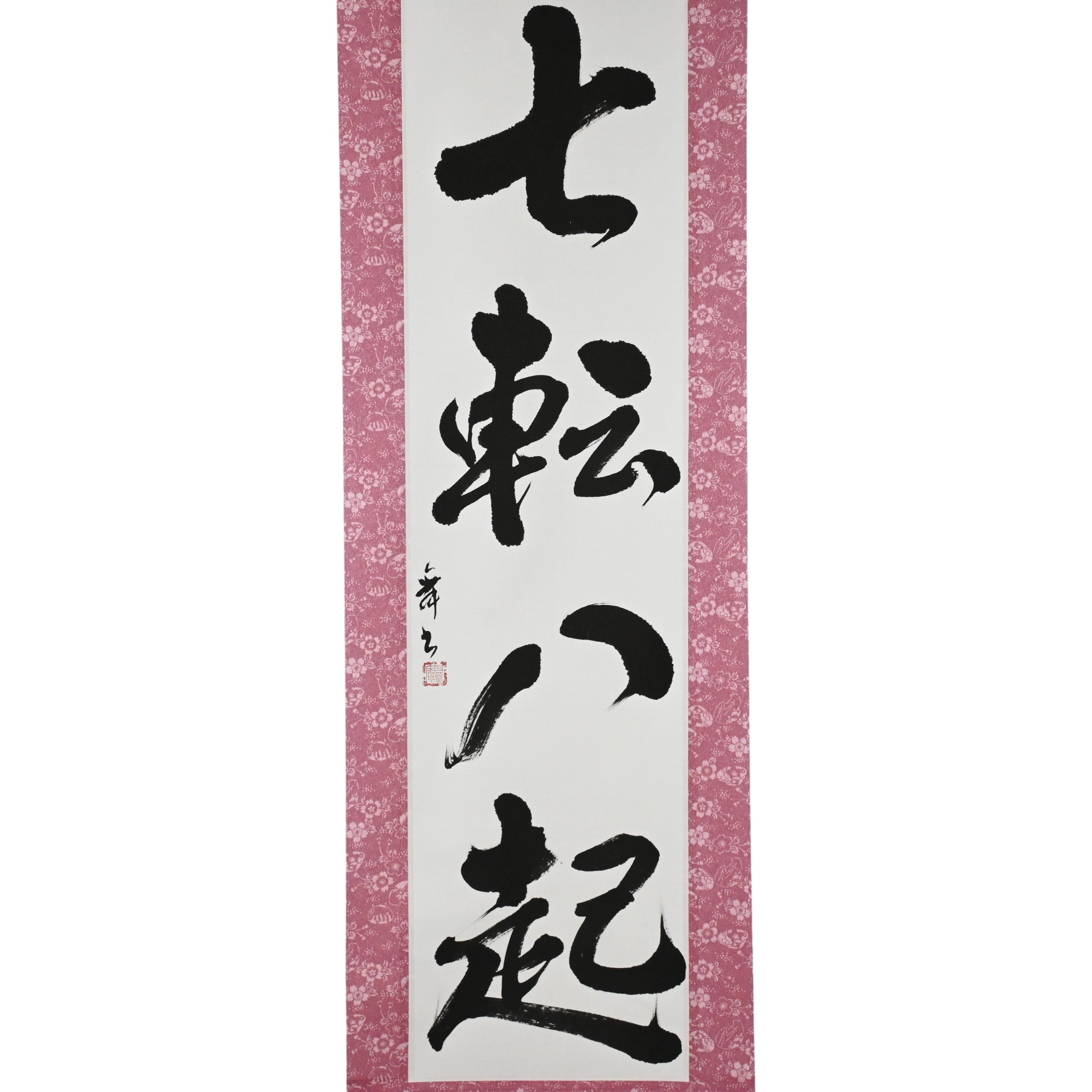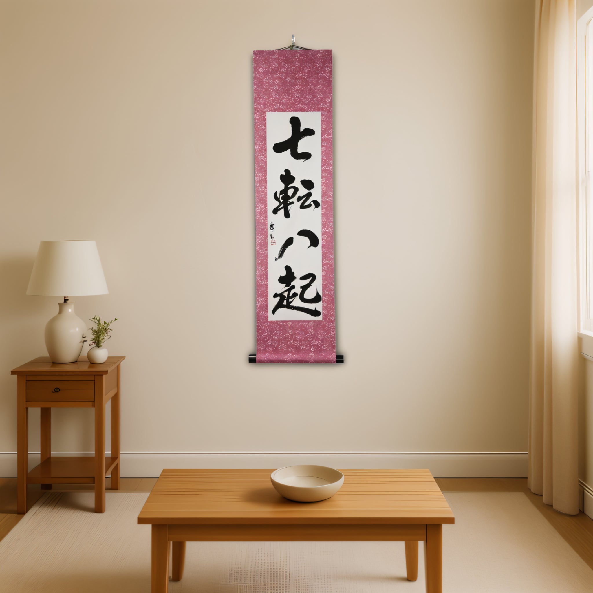This Japanese calligraphy scroll features the powerful phrase 七転八起 (Shichiten Hakki) — meaning "Fall seven times, rise eight". It embodies the indomitable spirit of the samurai: the unwavering resolve to rise again, no matter how many times life knocks you down.