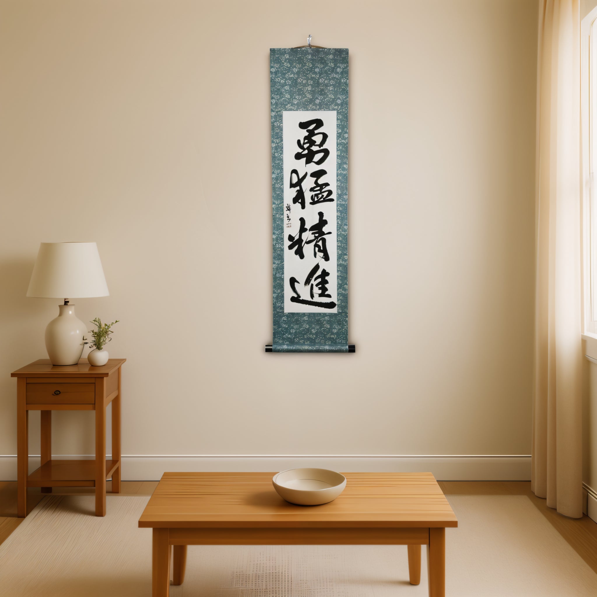This Japanese calligraphy scroll features the powerful phrase 勇猛精進 (Yūmō Shōjin) — expressing courageous action and disciplined perseverance. Deeply rooted in the way of the Samurai, it reflects a Samurai’s resolve to face adversity without fear and to devote themselves fully to self-cultivation.