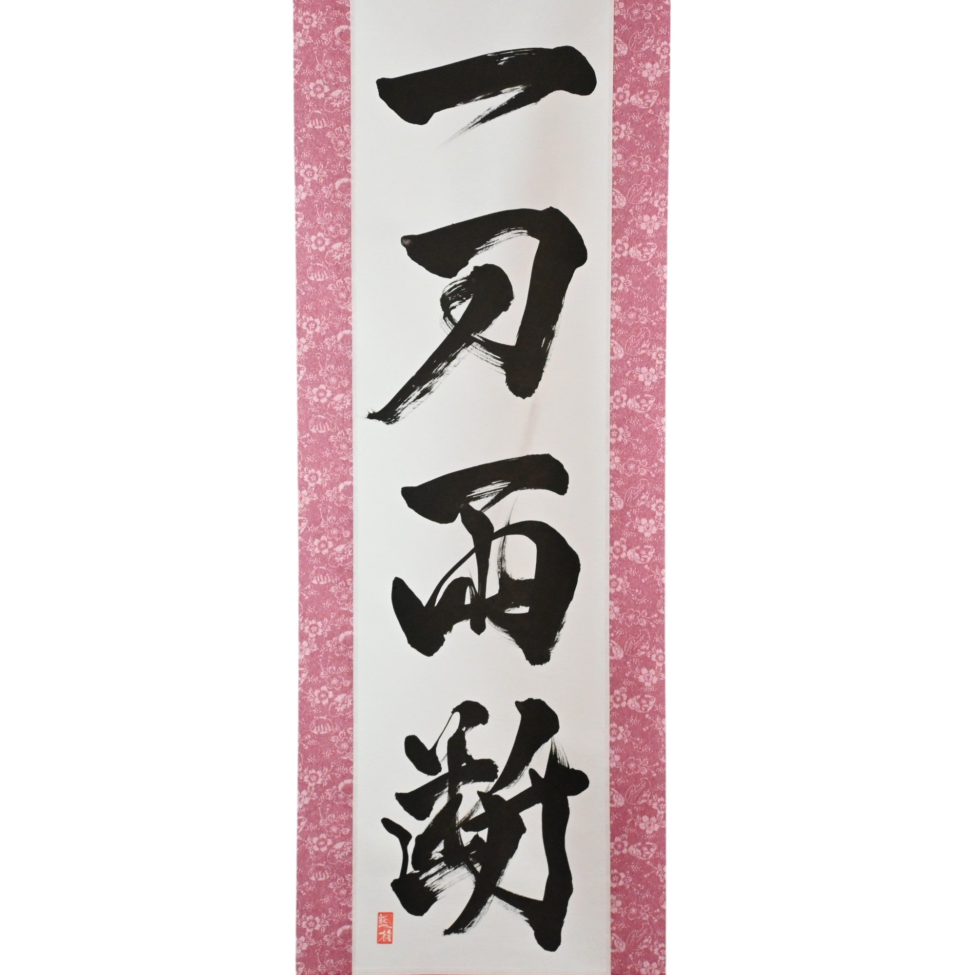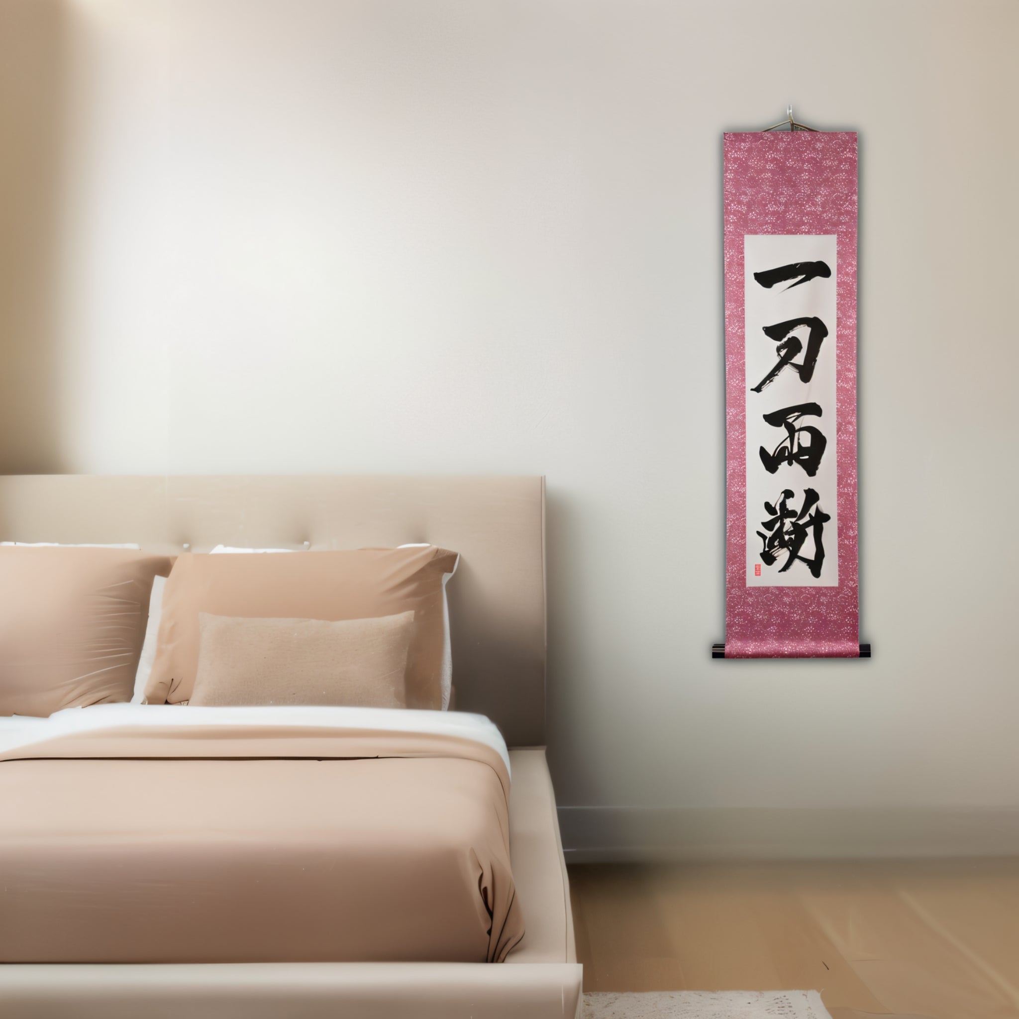 Este pergaminho de caligrafia japonesa exibe ousadamente a frase 一刀両断 (Ittō Ryōdan) — uma expressão poderosa que captura a determinação inabalável e a clareza do espírito samurai.