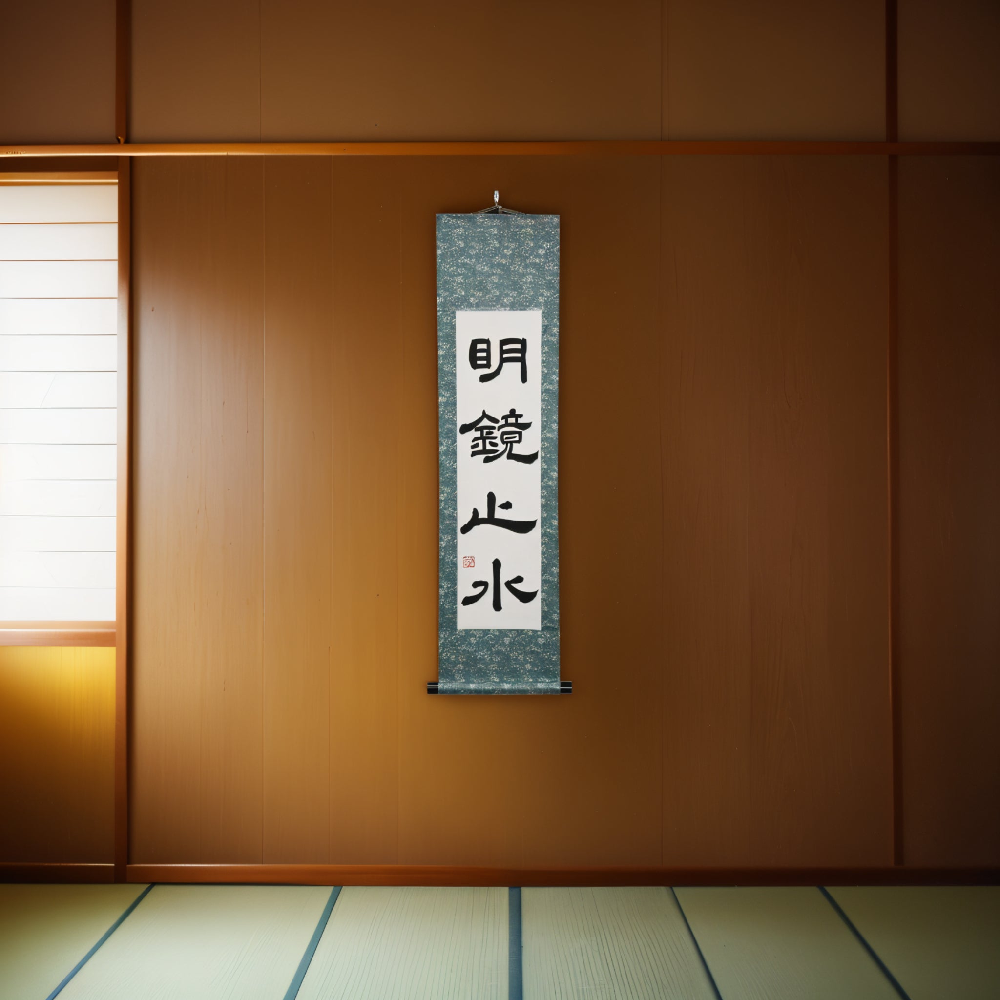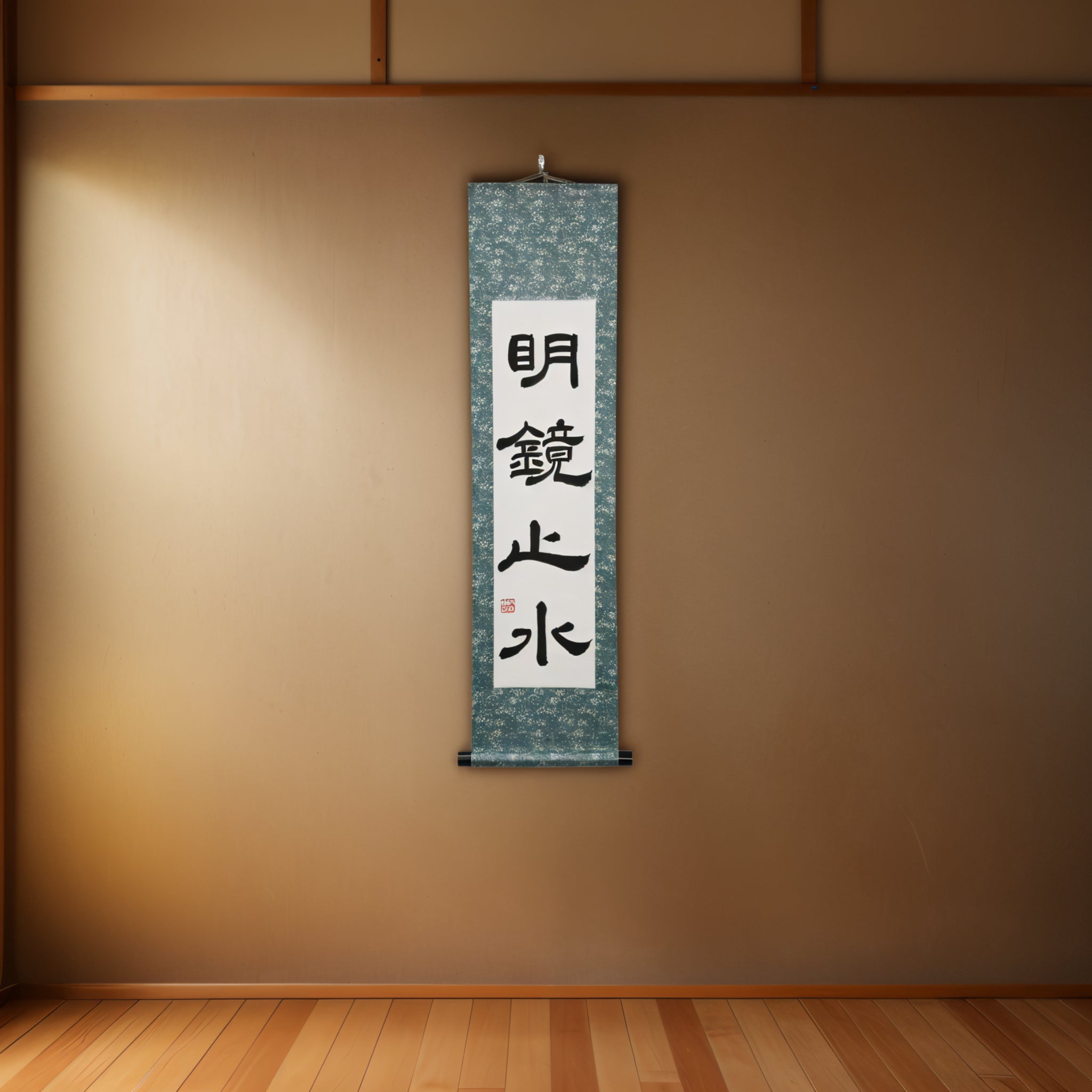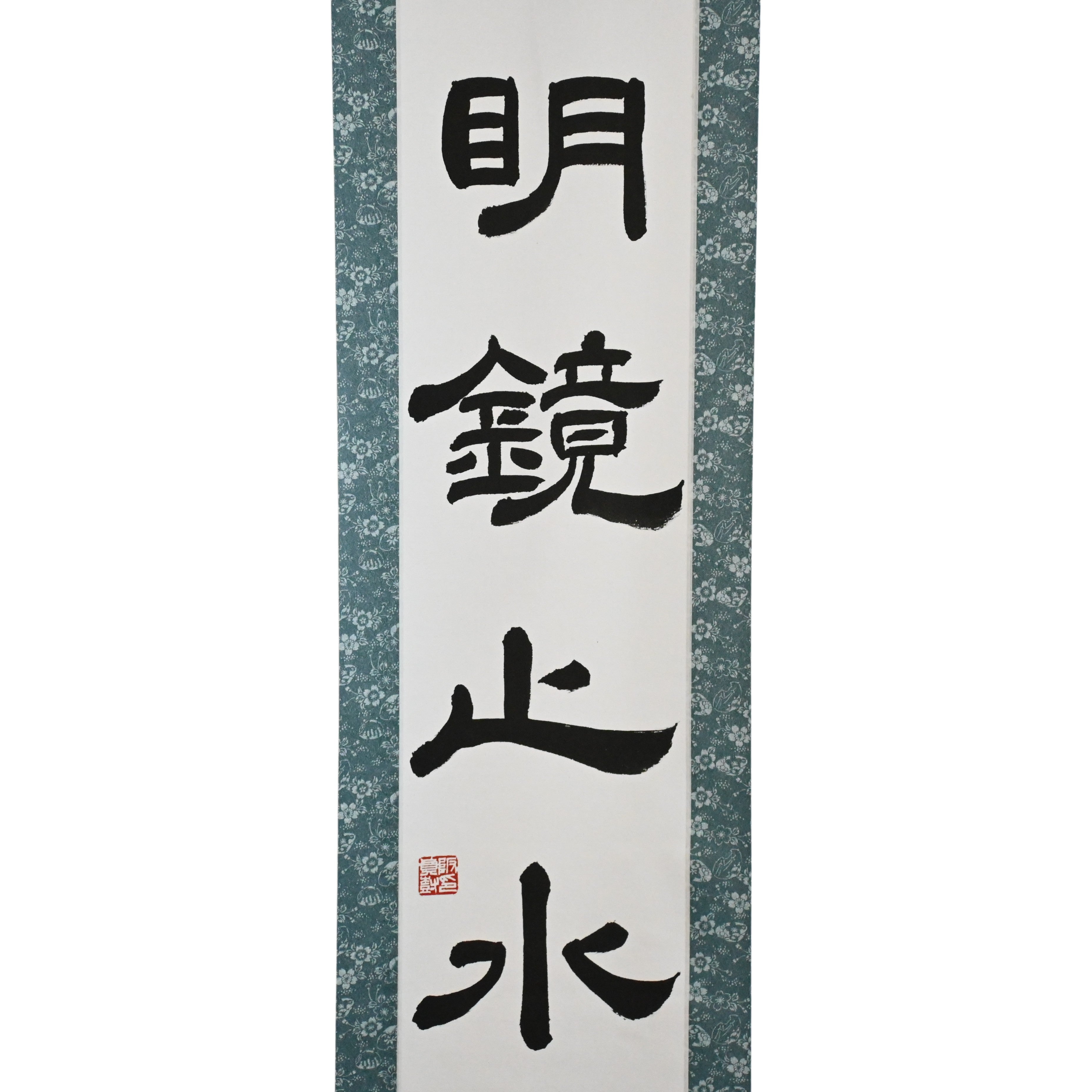 Este pergaminho de caligrafia japonesa apresenta a frase serena 明鏡止水 (Meikyō Shisui) — um estado de espírito comparado a um espelho impecável e a um corpo d'água perfeitamente calmo. Representa clareza, calma interior e a força silenciosa que surge quando o coração está livre de ruído e distrações.